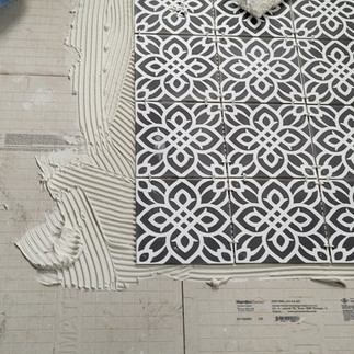 Well, this week saw some TILE-TASTIC changes in our kitchen! Thanks to our AMAZING sponsored flooring tile from The Tile Shop, we are seeing a graphic black and white instead of subfloor! Check out the Bolshoi Negro we selected paired with cast iron grout for a super clean and dark aesthetic! Baby steps are happening but I feel confident in all of the decisions made as the products come rollin' in!